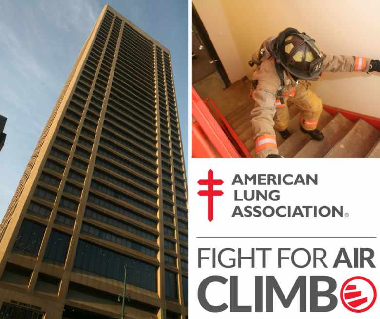 The Fight for Air Climb is a clever twist on your typical 5K; it’s actually a vertical race! In Buffalo on Saturday, March 10th it’s a Climb to the top of Seneca One Tower. We'll climb 800 stairs in an inside stairwell (where it’s warm). If you think that sounds like an impossible feat, consider this: area firefighters will be climbing in an adjacent stairwell…. in FULL GEAR! This adds more than 60 pounds of weight as they trudge up those 800 stairs. Now that’s a challenge!