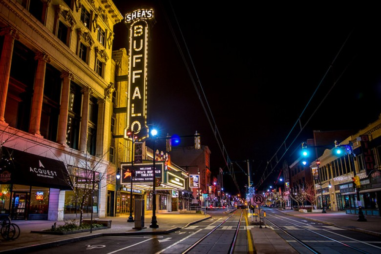 The streets were alive! Couples were strolling from one brighly lit venue to the next. Gaggles of girls in short skirts and high heels were bobbing and laughing along the broad, nearly snow-free Main Street sidewalks under fairy lights lacing the bare branches overhead. The line to enter Shea's wound down nearly to Chippewa, And every single parking spot - even all of the new ones on the 500 and 600 blocks of Main Street - was taken.