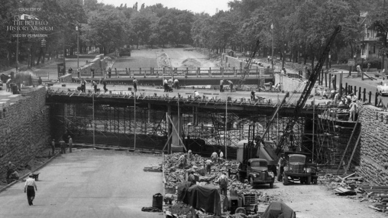 "When the new highway opened in 1961, drivers could cruise through the park at speeds undreamed of by the original park users. At 40 (and later 55 MPH), the often-surpassed speed limit was considerably higher than it was on Delaware Avenue or other city streets. The rush and whoosh of cars and trucks, so alien to Olmsted and Vaux’s concept of the tranquil country park, henceforth became an unavoidable feature of the landscape. Getting there mattered more than being there.