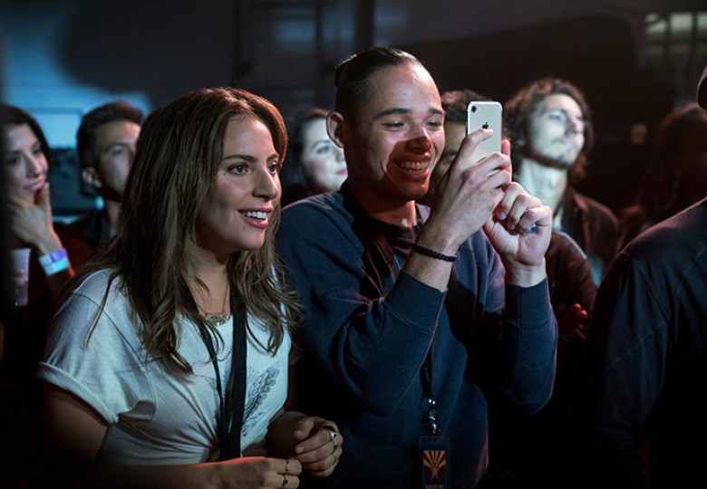 Co-writer Will Fetters (with Cooper and Eric Roth) has been quoted as saying the role of Jackson Maine (Cooper) was inspired by Kurt Cobain and the types of demons he would have carried with him to middle age had he not committed suicide. I get the comparison, but a twenty years younger version of Jeff Bridgescharacter in Crazy Heart (while his career was still booming despite an approaching decline) is probably more apt. Maine hasn’t lost his stadium show top-billing yet nor has he earned back anonymity in a twentieth century rife with camera phones constantly flashing in his face. His songs are on the jukebox and he’s recognized at the bar he stumbles into with nothing but alcohol on his mind. That’s where he sees her.