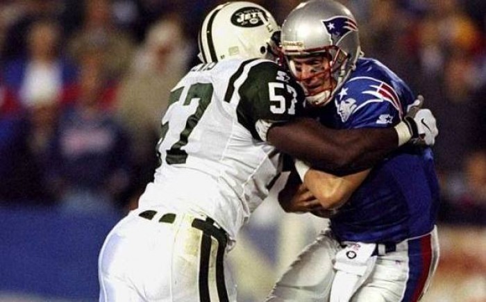 Few people had football on their minds during week two of the 2001 NFL season. The league had cancelled all games the week before following the attacks on New York City and the Pentagon in our nation’s darkest hour. My family and I decided to go to Indy long before the horrific events took place on that terrible Tuesday, and traveled to the RCA Dome to watch a young Payton Manning carve up our defense and crush the Bills 42-26. That was September 23, 2001. It was very clear after that week that there was a changing of the guard in the AFC East, but it wasn’t the Colts. On that same day the Jets traveled to Foxboro to play Drew Bledsoe’s Patriots in an early AFC East showdown. The Pats had just lost a tough game in Cincinnati during week one and were looking to bounce back against the hated Jets. The Patriots second year coach Bill Belichick had much to prove after a 5-11 record the previous year. Fans in New England would NEVER admit it now, but many of them wanted him out after just one season. Belichick had little success in Cleveland and after the Boston faithful had run Pete Carroll out of town Belichick was basically on the clock. The Jets were coming into New England with one of the league’s top pass rushing defenses leaving Bledsoe with an enormous target on his chest.