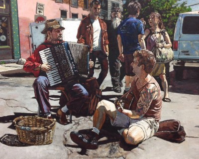 The subjects in these works are people from the streets, primarily buskers (musicians who perform on the street for voluntary donations). Included in each musician’s portrait are passers-by who do or do not give their attention (and dollars) to the buskers’ art. There are also among these works, street scenes suggesting an informal inter-play, or interlude, between individuals in other venues; outside a bar, among street vendors, in a backyard, etc..