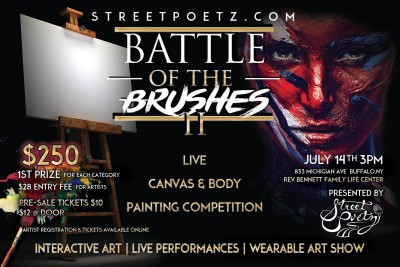 It's time for the 2nd Annual Battle of the Brushes by StreetPoetz.com and this year will be even more exciting than last year! Canvas Artists & Body Painting Artists will be competing for a chance to win $250 each while racing against a 2-Hour Clock! Enjoy the Wearable Art Show, Artistic Mannequin Modeling, Live Music, Spoken Word, and other performance. Refreshments for sale, free face painting for the kids, henna, interactive activities and more!