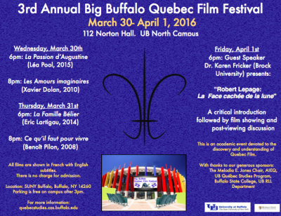 Enjoy two free modern films each day that address a variety of issues of importance to global citizens at the 3rd Annual Big Buffalo Quebec Film Festival. Films will be in French with English subtitles and will show at 6:00pm and 8:00pm on UB North Campus in Woldman Theater (112 Norton Hall) as follows: