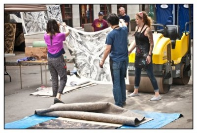 Steamroller printmaking! Watch a huge hunk of motorized metal make awesome prints of hand-carved lino & wood cuts by local printmakers…the analog way.