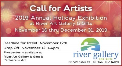 Artists are invited to submit artwork for River Art Gallery's Annual Holiday Exhibition 2019. The prospectus is due ASAP; Art Drop Off is November 12th, 2019, from 1:00 until 4:00. You can pick up your copy of the prospectus at River Art Gallery, 83 Webster Street, in North Tonawanda. Other important dates include:
