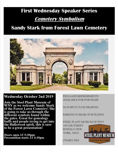Join the Steel Plant Museum of WNY as we welcome Sandy Stark of Forest Lawn Cemetery! She is going to take us through the different symbols found within the gates. Great for genealogy buffs and people trying to get into the Halloween spirit, this is sure to be a great presentation!