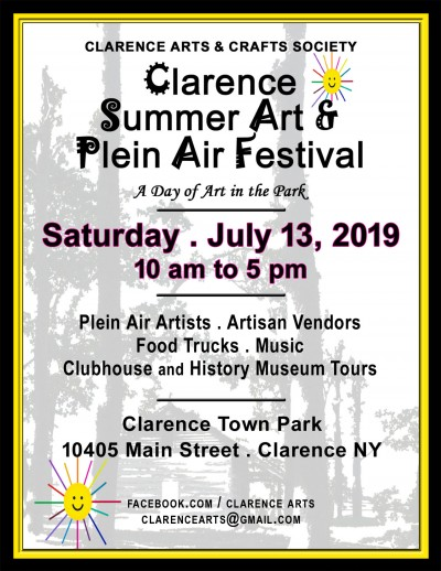 A Day of Art in the Park. The Clarence Arts and Crafts Society annual Clarence Summer Art & Plein Air Festival will be held Saturday, July 13, 2019, 10:00A to 5:00P at the Clarence Town Park, 10405 Main Street.