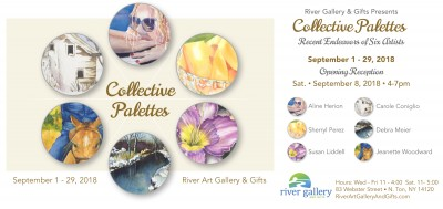 Collective Palettes - Recent Endeavors of Six Artists will premiere on September 1st at the River Gallery! Featuring Debra Meier, Carole Coniglio, Aline Herion, Sherryl Perez, Susan Liddell and Jeannette Woodward the event will run through September 29th. The opening reception will be from 4-7 PM on September 8th.