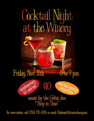 Cocktail night is an event we created to showcase how unique and tasty cocktails can be crafted using Victorianbourg Wines. Our cocktails go beyond the traditional Sangria and Mimosas to create a tasting experience that is sure to tantalize your taste buds! The evening will have a happy hour atmosphere with live music performed by Celtic duo Step In Time and complimentary cocktail munchies. There will also be opportunities to win prizes!! Compete in our Cocktail Competition for the chance to win a bottle of wine of your choice, and have your cocktail featured on our