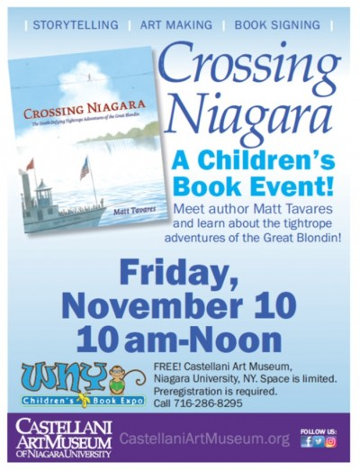 Kids can enjoy art making, storytelling, a book signing of Crossing Niagara, and a meet & greet with children’s author Matt Tavares. Learn about the amazing tightrope adventures of the Great Blondin at Niagara Falls! Space is limited and pre-registration is required. Call 716-286-8295 to register.