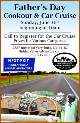 Father's Day Cookout and Car Cruise, Sunday, June 16, 10am-4pm. Treat Dad and the whole family to a day of fun and adventure. Classic cars on display (free); Wild Game Safari rides: Adults $18; Children (3-10) $14 (age 2 and under free); Small Animal Adventure (without safari ride) $6. Cookout menu prices apply. Dads $2 off Safari ride Fri., Sat., Sun. Father's Day Weekend. Just 20 minutes from East Aurora. www.hiddenvalleyadventure.com