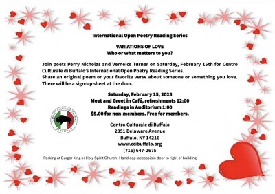 "There is not a saying, a smile, a look, a laugh, an act that does not gently touch my heart! Ah! if I were a painter, I would paint this portrait all my life." By Italian Poet Edmondo De Amicis (From "Cuore/Heart" inspired by his two sons) International Open Poetry Reading Series VARIATIONS OF LOVE Who or what matters to you? Join poets, Perry Nicholas and Verneice Turner, on Saturday, February 15th, 2025 for Centro Culturale di Buffalo's International Open Poetry Reading. Share an original poem or your favorite verse about someone and or something you love. There will be a sign-up sheet at the door. Saturday, February 15, 2025 Meet and Greet in Café 12:00 pm (refreshments provided) Readings in Auditorium 1:00 pm $5.00 for non-members. Free for members. Centro Culturale Italiano di Buffalo 2351 Delaware Avenue Buffalo, NY 14216 Parking at Burger King or Holy Spirit Church. Handicap-accessible door to the right of the building.
