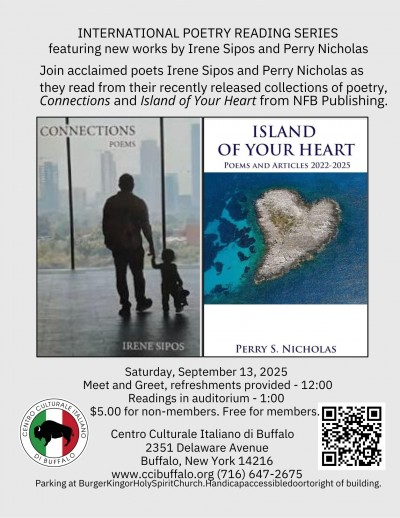 2351 Delaware Ave Buffalo, NY 14216Please join us at the Centro Culturale Italiano di Buffalo (CCI) as poets Irene Sipos and Perry Nicholas read from their recently released collections of poetry, "Connections" and "Island of Your Heart" from NFB Publishing. Irene Sipos, earned her Master of Arts in the legendary 1970's English Dept. of SUNYAB . She recently retired from SUNY Buffalo State. She is a former host of the reading series "The Book Corner" at the Congregation Shir Shalom in Amherst. Perry Nicholas, semi-retired professor at NCCC. Founder of the International Poetry Reading Series at the Centro Culturale Italiano di Buffalo (CCI). Honored with the Chancellor Award of the New York State Dept. of Ed. Former host of several reading series. Featured in readings throughout New York State and Greece.