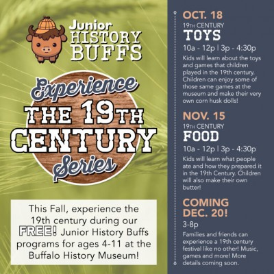 Junior History Buffs is a program at The Buffalo History Museum that engages children ages 4-9 in age-appropriate history lessons, songs, stories, crafts and games. A short program, or “Circle Time,” is instructor-guided and includes songs, a brief lesson about local history and a story. After this, self-guided activities can be enjoyed by the whole family such as a craft, interactive artifact explorations, and games related to the exhibits.