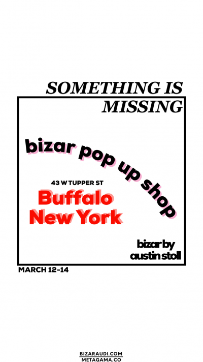 Bizar by Austin Stoll presents a pop up shop courtesy of Metagama Atelier. Presenting an exclusive in store release of the new capsule by Bizar titled “Something Is Missing." Items will be available in store from March 12th - March 14th. Limited items from the collection will be available online. More details coming.