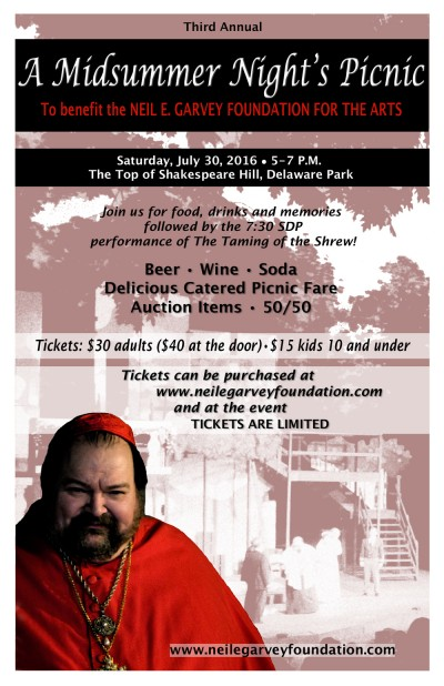 This pre-picnic for Shakespeare in Delaware Park's performance of Taming of the Shrew honors the inestimable Neil Garvey and is a fundraiser for the Neil E. Garvey Foundation for the Arts. Join Neil's friends and family to share memories, some picnic fare, and a lot of laughs on Shakespeare Hill, above the brand new stage in Delaware Park! Tickets are going quickly, so reserve yours today.