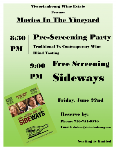 **NB: Weather permitting June's screening will take place outside. We highly recommend calling and reserving you spot ahead of time to guarantee your spot for Sideways by calling the winery at 716-751-6576 or emailing info@victorianbourg.com**