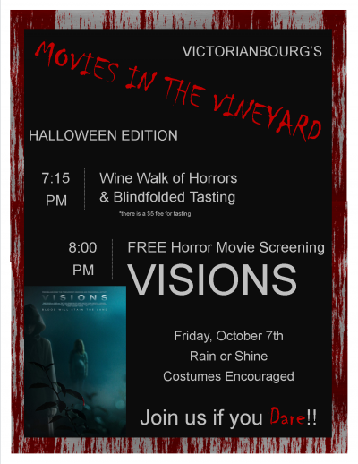 4402 East Lake Road Wilson, NYJoin us for our Halloween Horror free Movies in the Vineyard - Visions. Visions is a chilling tale of newly pregnant Eveleigh and her husband who purchase a vineyard so they can start a new life. As they begin to settle in Eveleigh begins to experience terrifying visions, and things start to take a turn for the worse. What do the visions mean and what is the cause? The answers are sure to shock you!
