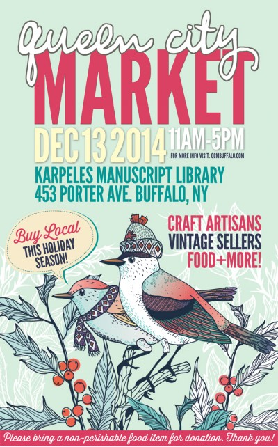 After the amazing turnout we had last year, the fourth annual Queen City Market will be held on Saturday December 13th, 2014 from 11am to 5pm at the Karpeles Manuscript Library Museum at 453 Porter Avenue in Buffalo, NY. This event will feature 50+ local vendors, selling either handmade or vintage items. Each vendor was handpicked to guarantee a wide selection of goods–including jewelry, ceramics, vintage clothing and housewares, local foods, and much more. This is a free event and is open to the public, so please pass it on! We want this to be a day that promotes our city and the people in it.