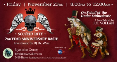 Join us in celebrating Revolution Gallery's Second Anniversary with a party, and an opening reception of “On Behalf of the Under Enthusiastic" - a solo show by Joe Vollan. See works by 50 local / national / and international artists throughout our gallery. Music by DJ Dr. Wisz. Enjoy complimentary champagne from 8:00pm to 9:30pm