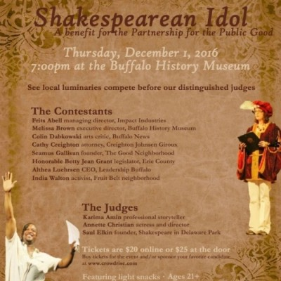 One Museum Court Buffalo, NY 14216Watch Buffalo's civic leaders compete with each other by performing great speeches and poems by William Shakespeare. Esteemed civic leaders will compete for the prize before all-star judges Karim Amin, Annette Christian, and Saul Elkins. But it's the audience vote that crowns the Idol!