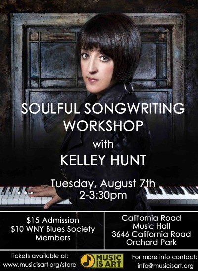 Celebrated touring singer, songwriter, and recording artist, Kelley Hunt brings a wealth of career experience as a published songwriter and performer to a special “Soulful Songwriting” workshop Tuesday, Aug. 7 at 2pm at California Road Music Hall in Orchard Park hosted by Music Is Art. The workshop is for ages high school and above.