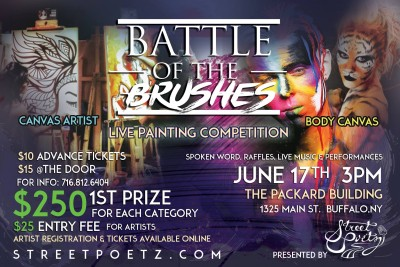 On Saturday, June 17, 2017, 28 Canvas Artists and 10 Body Canvas Artists will be given 2 hours to battle it out in front of spectators, as we enjoy live music and spoken word while we count down the final seconds until the final brush stroke. The winner in each category will be awarded a cash prize of $250 in addition to the title of WNY’s Brush Master!
