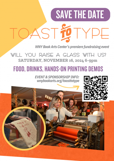 468 Washington St Buffalo, NY 14203Toast to Type is WNY Book Arts Center’s premiere fundraising event, now in its eighth year! On Saturday, November 16, 2024, from 6-9pm, join us at Book Arts as we “toast to type” and celebrate the creativity of bookmaking & printmaking arts! Enjoy an assortment of locally produced artisan beer and cider, hors d’oeuvres from local restaurants, creative basket raffles, music, and more! As a signature of the event, patrons are invited to participate in the creation of a variety of handmade goods – tote bags, coasters, prints, stationery & more – all printed by hand with our antique printing presses. Tickets are limited and available presale online prior to the event, and are $60 for one ticket, or $115 for a pair. All proceeds from Toast to Type support arts education programs at Book Arts, a 501(c)3 arts education non-profit!