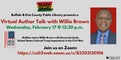 Buffalo native and author Willie Brown will discuss his book United States Colored Troop Importance in the Civil War. Free, via Zoom. A Black History Month program.