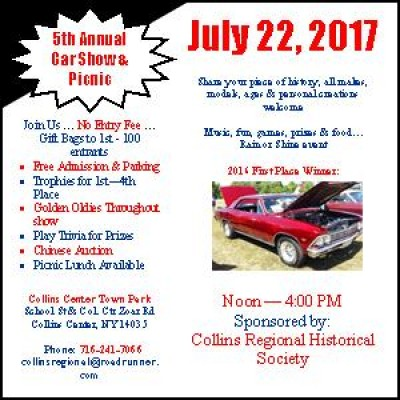 Sponsored by the Collins Regional Historical Society, this event gets bigger & better every year! Whether you want to show others your beauty from days gone by, or just want to browse, this event is for you. Drivers receive free registration & free thank you gift bag for bringing their cars; first through fourth place receive trophies. A picnic lunch is available to curb those hunger attacks and a baked good sale & Chinese Auction only add to the fun. Rain or shine event. Held at the Collins Center Town Park.