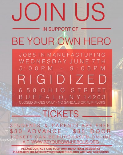 About the Event - Be Your Own Hero, a 501(c)3 WNY non-profit organization along with local advanced manufacturers come together to host the inaugural “Jobs in Manufacturing: Introducing Students to Profitable Careers” event at Rigidized Metals Corporation on Wednesday, June 7, 2017 5:00-9:00pm.