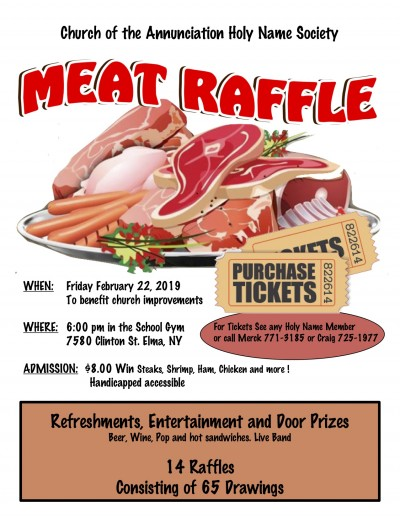 The Holy Name Society of the Church of the Annunciation, 7580 Clinton St., Elma, will host a meat raffle at 6:00pm Friday, Feb. 22 in the school gym.