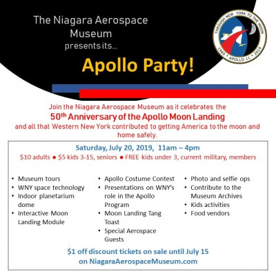 Apollo Party Tickets: $10 adults ● $5 kids 3-15, seniors ● FREE kids under 3, current military, members. $1 off discount tickets available until July 15 at https://niagaraaerospacemuseum.org/museum-store/apollo-11-party-tickets/