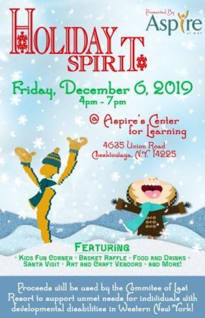 This is our annual holiday vendor event with 100% of the proceeds going towards Aspire of WNY's Agency Outreach Program that supports unmet needs for individuals with developmental disabilities. We will have Vendors, Basket Raffle, Food and Drinks, Santa Visit with photos, Kids Fun Corner and More!!