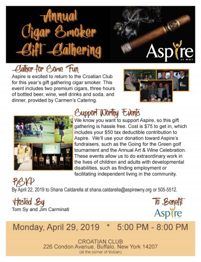 Aspire is excited to return to the Croatian Club for this year’s gift gathering cigar smoker. This event includes two premium cigars, three hours of bottled beer, wine, well drinks and soda, and dinner, provided by Carmen’s Catering.