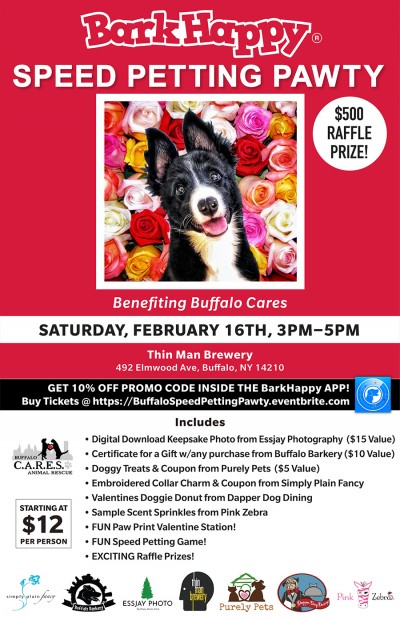 Grab your pooches, prepare for smooches, and join BarkHappy at Thin Man Brewery for a Speed Petting Pawty on February 16! Fill your complimentary goodie bag with plenty of freebies while shopping the many selections from our amazing sponsors! Don’t forget to grab your favorite brew at the bar before enjoying the Paw Print Valentine Station and Speed Petting Game! You’ll remember the love with a complimentary keepsake digital photo from Essjay Photography! Free Raffle Entry with admission and EXTRA Raffle Ticket for pooches &/or people dressed in the Valentines theme! Grab your tickets today to help benefit Buffalo Cares Animal Rescue, see you there!