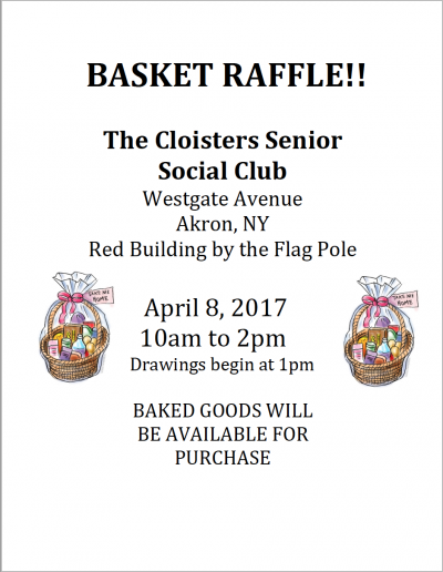 The Cloisters at Akron Senior Social Club is sponsoring its annual Basket Raffle. Doors open at 10:00am. Drawings begin at 1:00pm. Baked good will be available for sale. Tickets for the raffle are $5 per sheet.