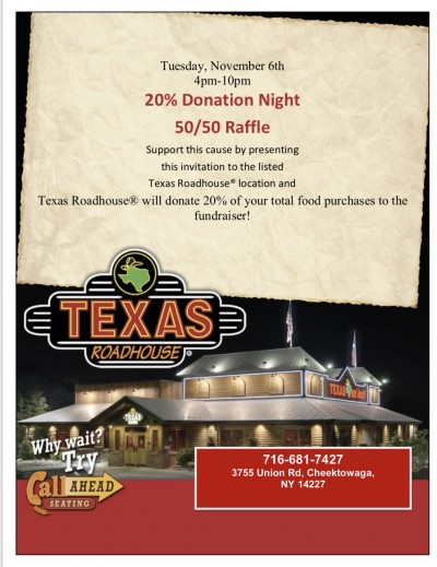 We’re having a fundraiser at Texas Roadhouse at 3755 Union Road, Cheektowaga, NY 14225 on Tuesday, November 6 from 4pm to close. Texas Roadhouse will donate 20% of all purchases back to our group with the exception of alcoholic beverages and coupons. We will also be have baskets raffles, 50/50 and candy bars for sale to benefit the group.