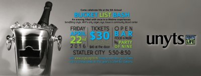 Celebrate life at the 5th Annual Bucket List Bash! An evening filled with once-in-a-lifetime experiences benefitting Unyts, WNY's only organ, eye, tissue & community blood center.