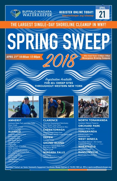 Buffalo Niagara Waterkeeper is hosting its annual Spring Sweep. This massive undertaking see the community coming out to tackle around 50 different sites on Saturday, April 21. According to Waterkeeper, “Last April, more than 2,000 volunteers helped to clean up more than 16 tons of litter from shorelines in Niagara and Erie counties!”