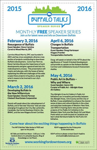 Part of Working For Downtown's monthly Buffalo Talks Speakers series held on the first Wednesday of the month from October through May at the Buffalo & Erie County Public Library. This event is free to the public. Attendees are welcome to bring their own lunch.