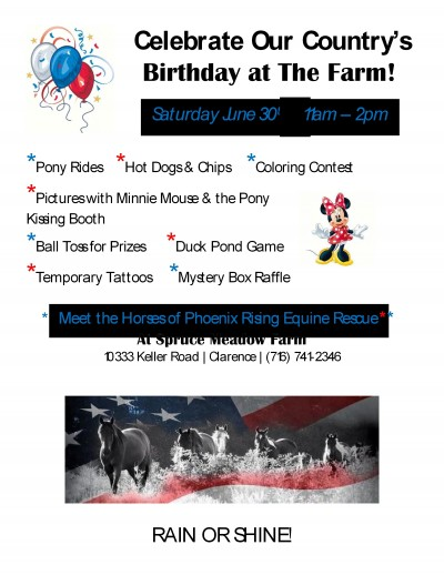Meet the Rescue horses of Phoenix Rising Equine Rescue . Pony rides , Hot dogs , Coloring contest , pictures with Minnie and the pony kissing booth , Duck pond game, temporary tattoos and a mystery box raffle. Rain or Shine !!