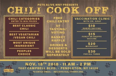 7007 Campbell Blvd Pendleton, NY 14120It is the Bills bye week, so come spend it with us! Pets Alive WNY will be holding a Chili Cook-off event to raise some funds for our resident dogs & cats! Entry into the cook-off is free and you have a chance to win prizes for the best in one of these 4 categories: