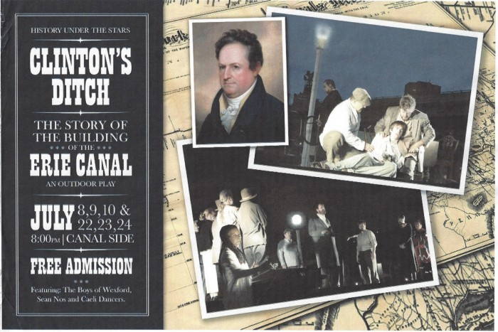 Clinton's Ditch is an historical outdoor play which has been performed at Canalside in the summer of 2009 and 2011. The play was staged at the historical site where the Erie Canal was completed in 1825, one of the most historical sites in the nation. The play is popular with children and adults as many children study the canal in school. Clinton's Ditch is fast moving and entertaining and brings to live audiences, live performances ,and a large cast of actors. It is the story of thousands of immigrants and farm workers taking up the tremendous task of digging a ditch 363 miles. The play dramatizes their long journey through primitive forests, swamps, and solid rock and the wilderness of New York . It is also the story of Governor DeWitt Clinton, the father of the Erie Canal, whose dream to build the canal was tested by the brute forces of powerful politicians, and a public which fought its completion.