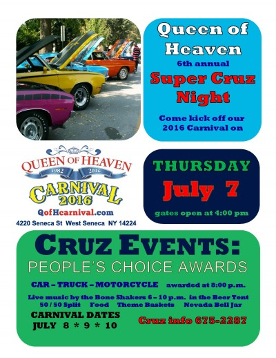 Super Cruz Night Kicks of the Queen of Heaven Carnival with a fun display of more than 300 vehicles and 150 Motorcycles ...Show Cars are also expected....It is a Relaxing time to walk around a see these classics while listing to the Boneshakers band and enjoying food and beverage. Go to QofHcarnival.com for more information...