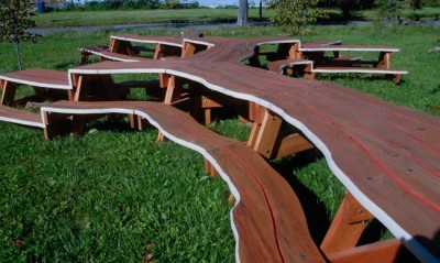 Then to a joint venture of the Farmer Pirates and ArtFarms. Set on land owned by the Farmer Pirates, a magnificent oversized wooden table designed and built by the artist Michael Beitz is the first of a number of public art projects planned for the East Side by ArtFarms. The table has been used to sort and sell produce and also as community space for art classes with Locust St. art school. Future ArtFarm sites include the Wilson Street Farm, None Like You, and the Pelion garden.