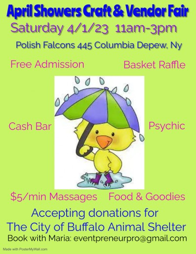 Come on out to support your local small businesses. We have some unique and faboulous crafters as well as some of your favorite vendors. There's something for everyone! Basket raffle! $5/5 min mini massages! Psychic! Goodies! Cash Bar at 1! No need to be present to win. Bring donations for the Buffalo Animal Shelter for extra tickets after initial purchase. Bookings only through Maria at eventpreneurpro@gmail.com
