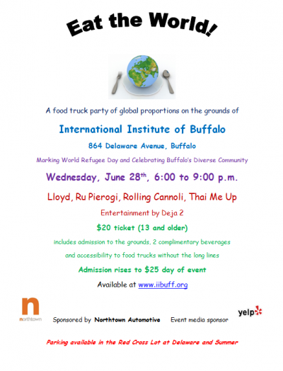 A party of global proportions in the backyard of the International Institute of Buffalo! Come celebrate Buffalo’s diversity and World Refugee Day, all while enjoying some of Buffalo’s best ethnic food trucks, Community Beer Works, and entertainment by Deja2.