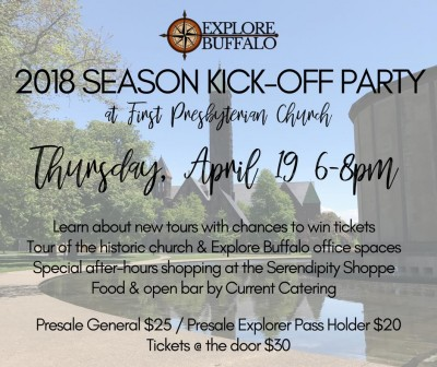 We're kicking off the 2018 tour season with a party! Join us at our home base at First Presbyterian Church on Symphony Circle on Thursday, April 19th to see what Explore Buffalo has planned for 2018. See what new tours and events are coming this summer, plus there will be chances to win tickets!